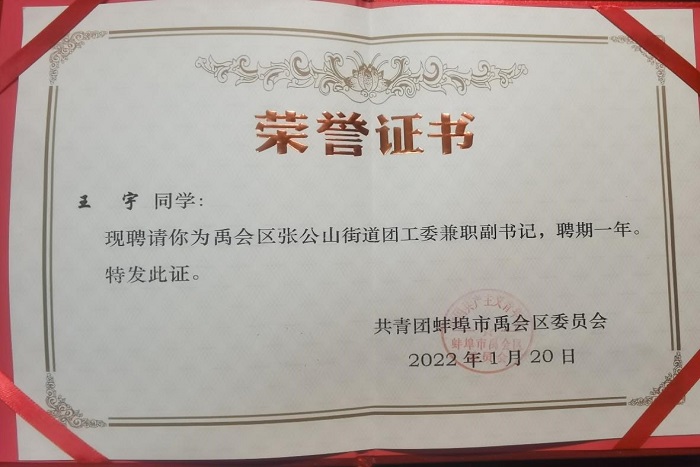 信中指出,王宇作为蚌埠籍大学生,能够主动请缨,积极响应号召,在家乡街道任职,在实践中锻炼自我,荣膺担当;思想开路,实干架桥,践行新时代大学生的理想与担当,能够在平日工作里以谦逊平和、踏实肯干的态度去了解群众,运用所学所思去帮助解决居民群众的实际问题,充分展现了1xbet官方网站_1xbet(中国)股份有限公司,学子的奕奕风采。
