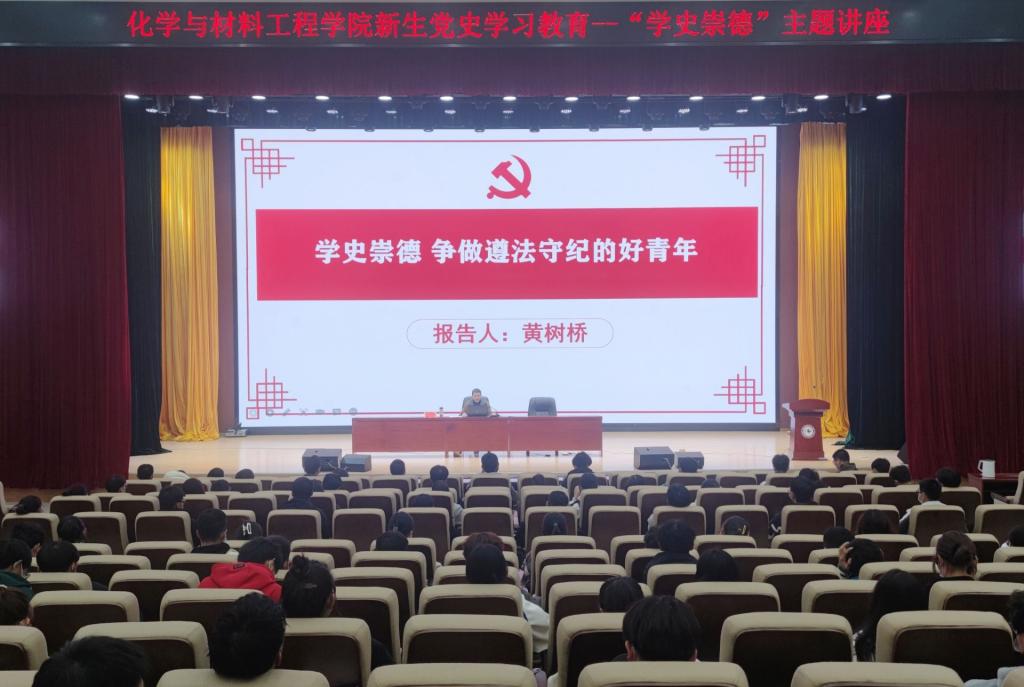 为加强2021级新生党性修养,按照学院党史教育有关要求,11月16日晚,化学与材料工程学院在东辅楼报告厅举行“学史崇德”主题讲座。学院党委书记黄树桥主讲,辅导员沈竞成主持,2021级新能源材料与器件和应用化学全体同学与会。