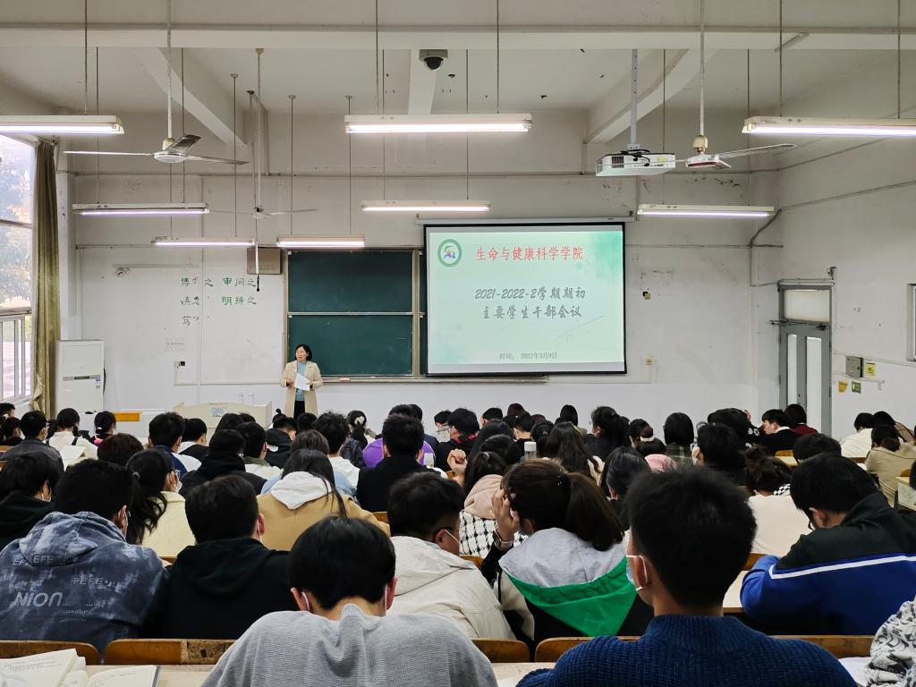 3月9日下午,生命与健康科学学院于求知楼A101教室召开本学期期初主要学生干部会议。学院党委副书记彭丽萍、正科级辅导员兼正科级组织员邓艳萍、分团委副书记姜毅、副科级辅导员刘国祥以及专职辅导员孙玉楼、张迪出席会议。毕业班各班班长、团支书,非毕业班各班班长、团支书、学习委员,团委、学生会、易班主要学生干部参加会议。本次会议由刘国祥主持。