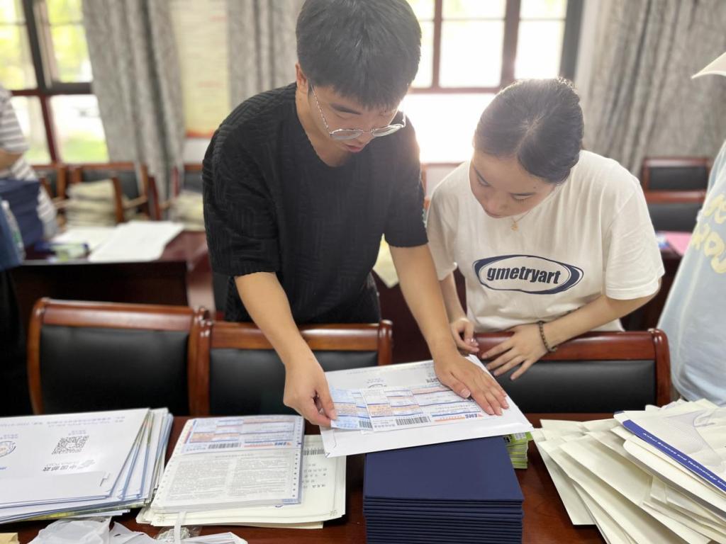 封装现场,付光玺调录取通知书的封装非常关键,要保证每一份录取通知书都能够、安全、精准地投递到新生手上,要求学生干部们认真装配好每一份录取通知书,仔细核对学生信息,保证录取通知书寄发工作的顺利开展。