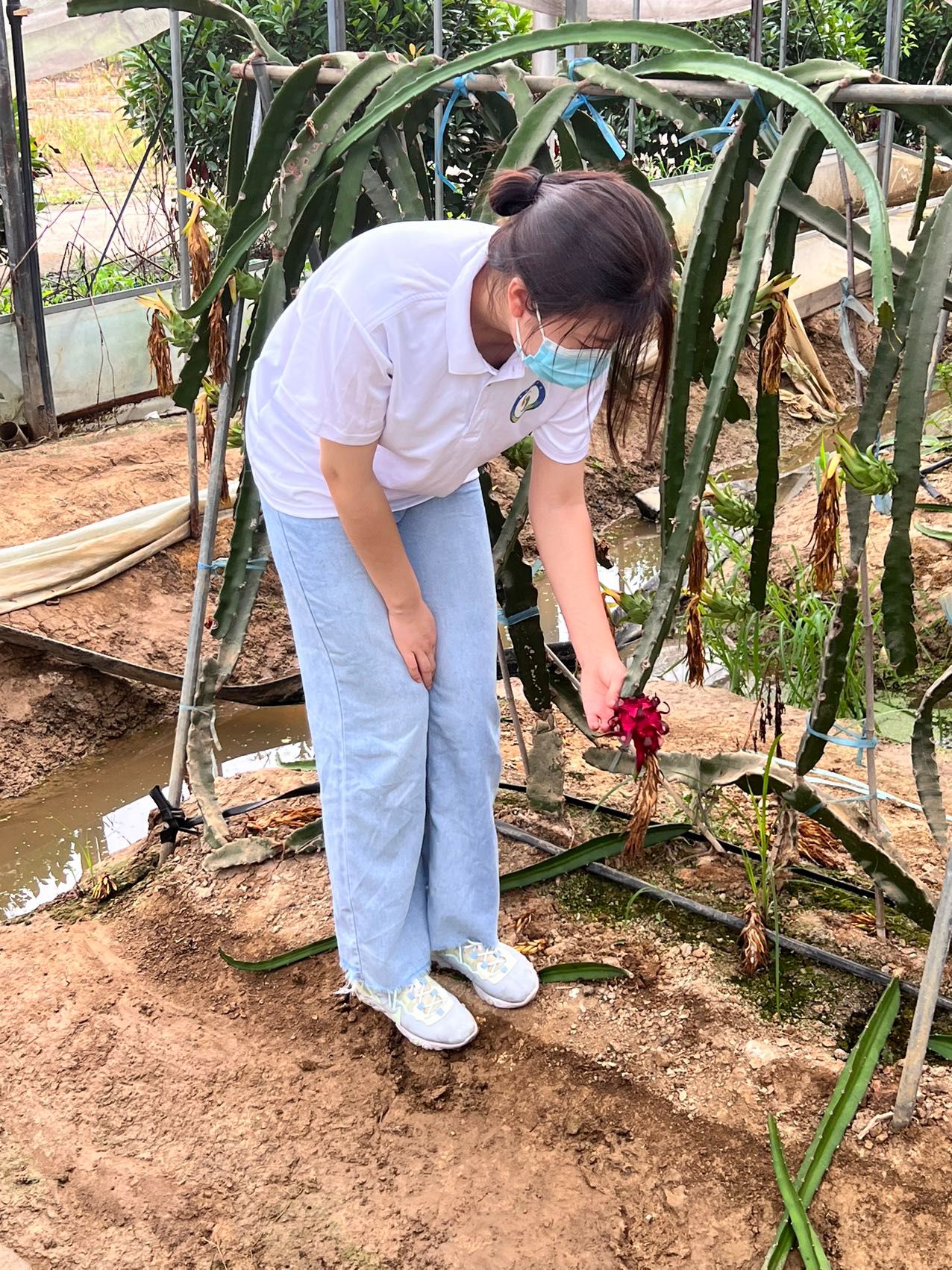 饮水思源,同学们品尝的水果从何而来,又能为水果产业做些什么?带着疑惑,带着期待,“裁雨留虹”团队所有人于上午9点成功抵达绿勤农业展开调查。基地很大,有超三千亩水果种植面积,队员们的目光首先被一团团似“火球”的红心火龙果吸引住了。